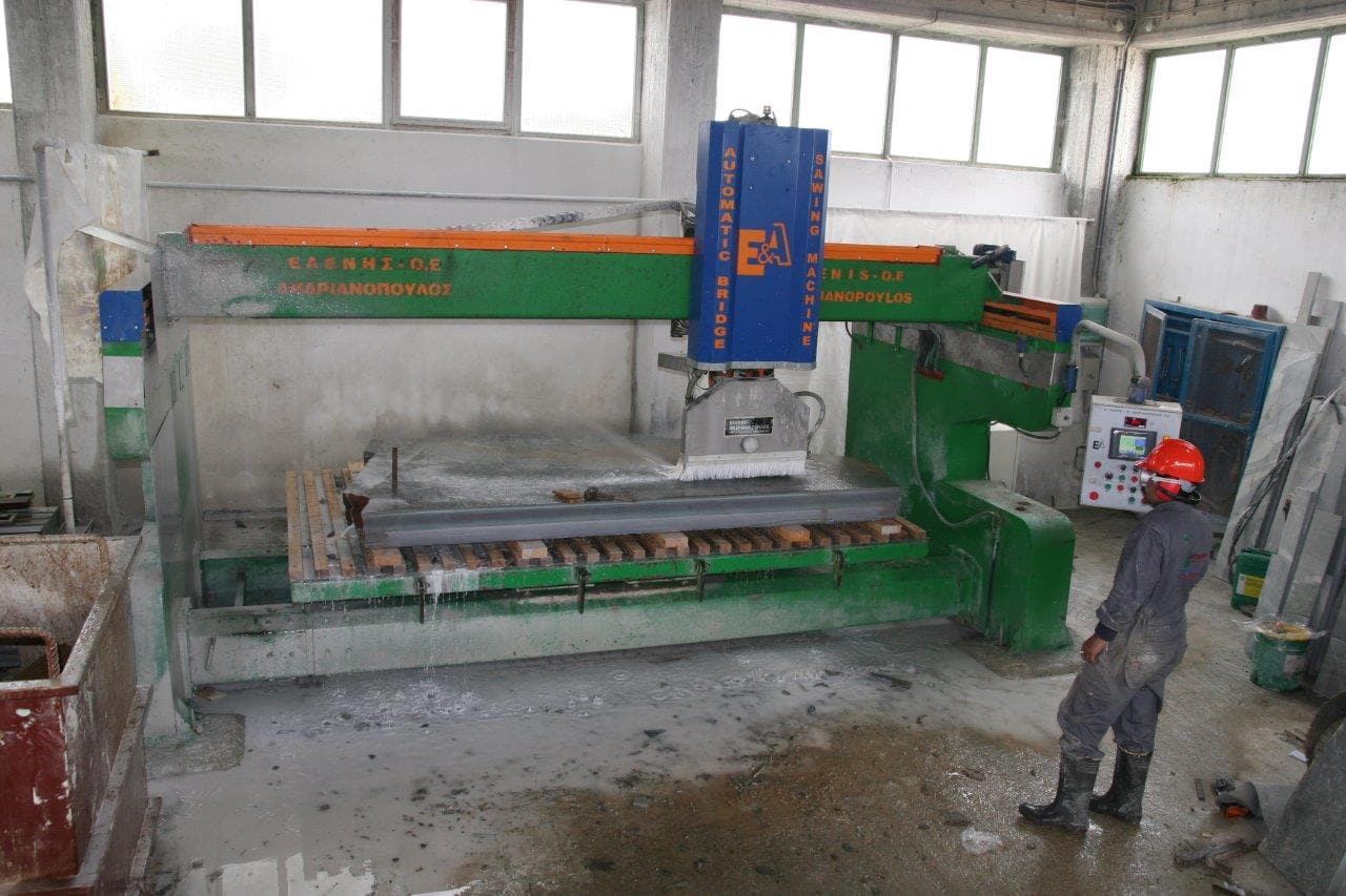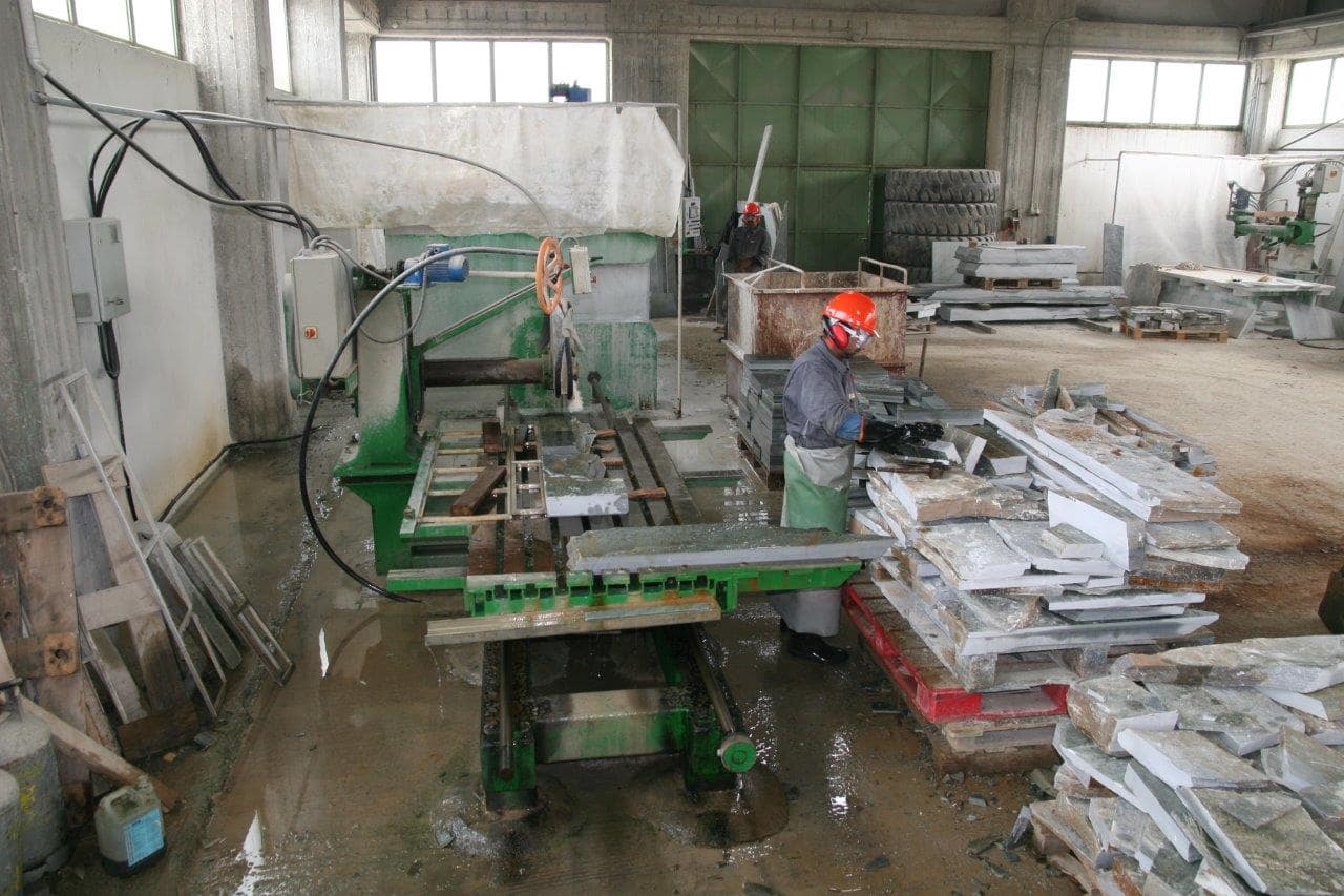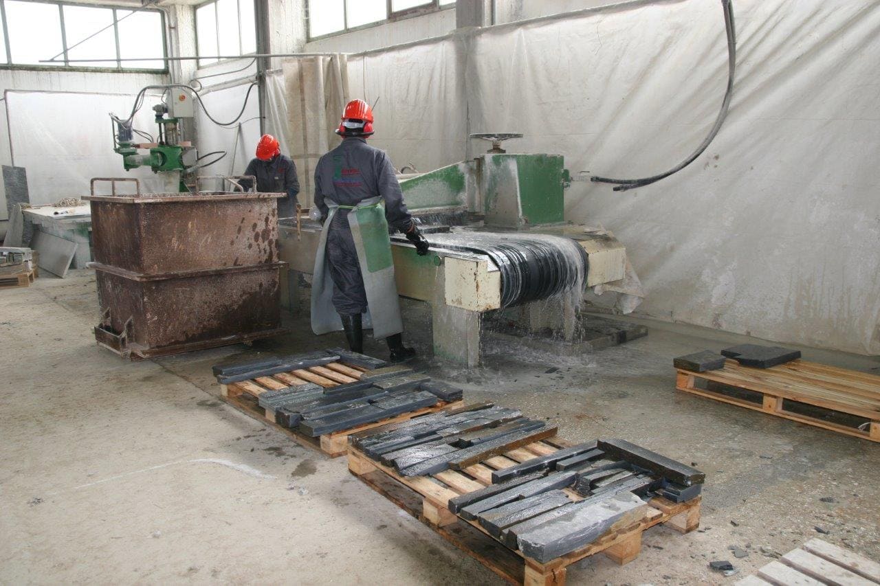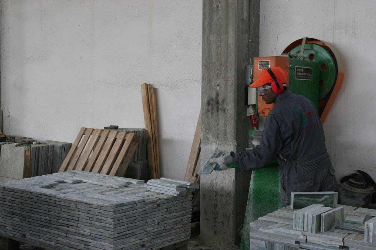 Στο εργοστάσιο γίνεται παραγωγή και επεξεργασία των προϊόντων μας. Καθημερινά επεξεργαζόμαστε περισσότερα από 1000m2 ακανόνιστων πλακών για πώληση εφαρμόζοντας το Σύστημα Διαχείρισης Ποιότητας. Όλα μας τα προϊόντα φέρουν σήμανση CE η οποία πιστοποιεί ότι είναι κατάλληλα για τη χρήση που προορίζονται σύμφωνα με την ισχύουσα Ευρωπαϊκή και Ελληνική Νομοθεσία.
